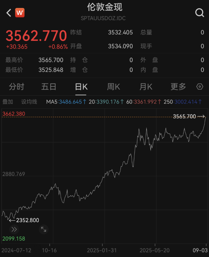 现货黄金价格直线飙升,首次站上3550美元/盎司,截至22:30,日内涨0.86%,报3562.77美元/盎司,今年迄今累计涨幅超35%。