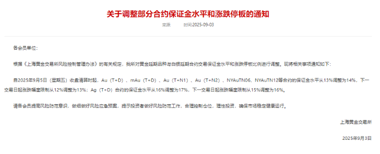 自2025年9月5日(星期五)收盘清算时起,Au(T+D)、mAu(T+D)、Au(T+N1)、Au(T+N2)、NYAuTN06、NYAuTN12等合约的保证金水平从13%调整为14%,下一交易日起涨跌幅度限制从12%调整为13%;Ag(T+D)合约的保证金水平从16%调整为17%,下一交易日起涨跌幅度限制从15%调整为16%。上金所要求各会员增强风险防范意识,做细做好风险应急预案,提示投资者做好风险防范工作,合理控制仓位,理性投资黄金,确保市场稳定健康运行。