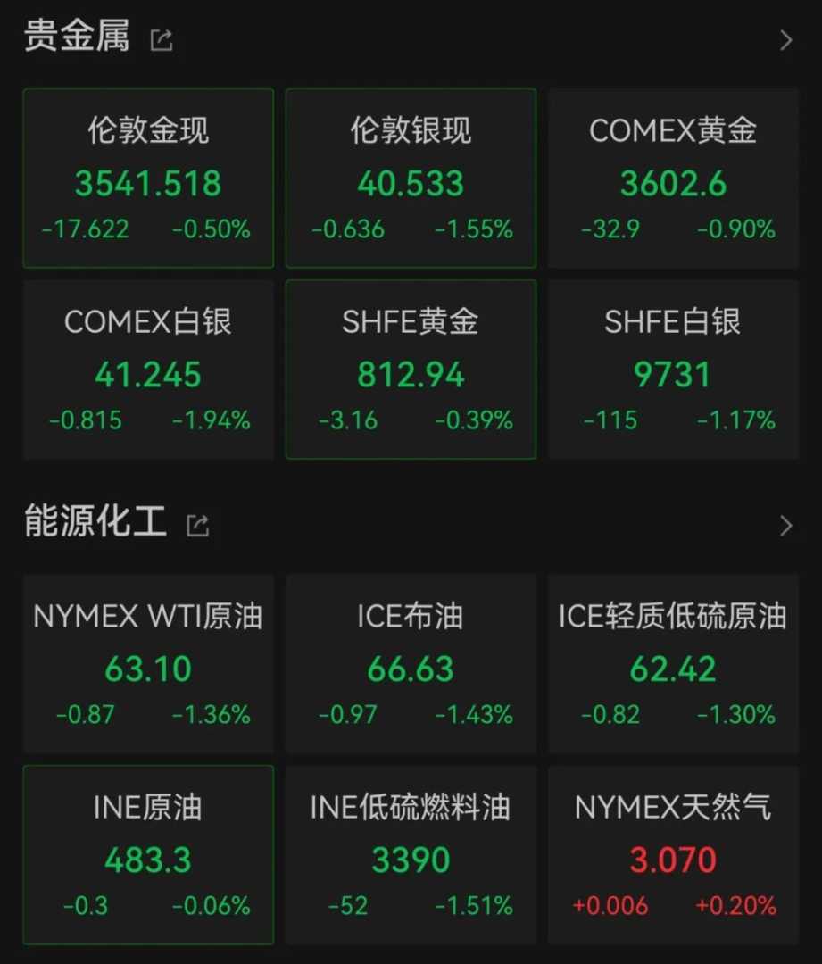 Wind数据显示,截至北京时间9月4日22:30,COMEX黄金期货价格下跌0.90%,但仍维持在每盎司3600美元关口上方;伦敦金现货价格跌0.5%,报3541.518美元/盎司。NYMEX原油期货主力合约、ICE布油期货主力合约双双跌逾1%。