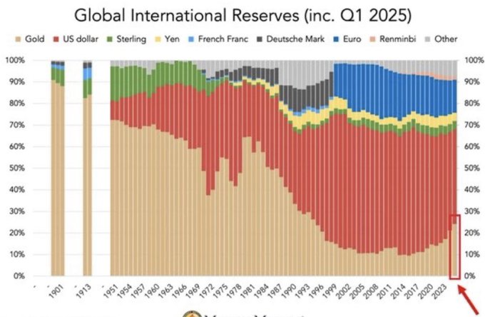 与黄金储备规模的攀升形成对比的是——美国国债在全球央行储备总量中的占比近年来则持续萎缩。据部分统计数据,其占比现仅为23%,远低于2010年代逾30%的峰值,且低于黄金当前27%的占比。