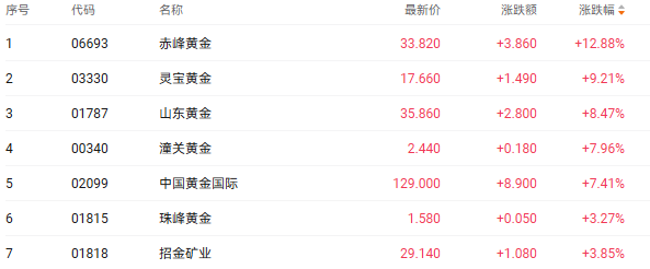 财联社9月9日讯在多重利好因素推动下,港股黄金股延续强势上涨。截至发稿,赤峰黄金(06693.HK)涨12.88%、灵宝黄金(03330.HK)涨9.21%、山东黄金(01787.HK)涨8.47%、潼关黄金(00340.HK)涨7.96%。