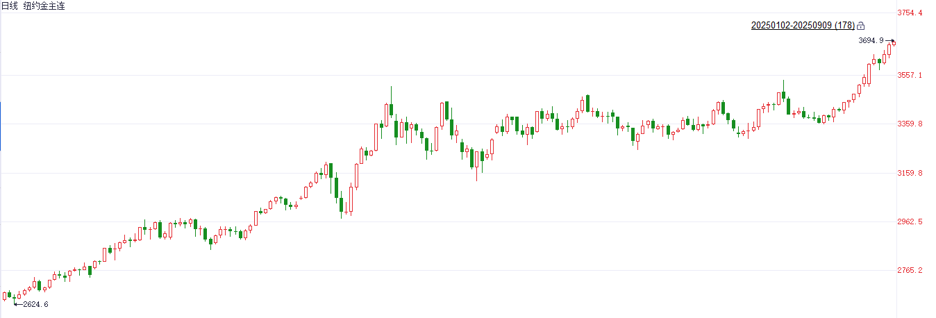 国际金价同样表现强劲。纽约黄金期货在昨日大涨后,今日再度走强。截至发稿涨0.23%,报3686美元。今年以来,该期货累涨超1000美元/盎司,年内涨幅接近40%。黄金价格的持续上涨,反映了全球市场对避险资产的需求增加。