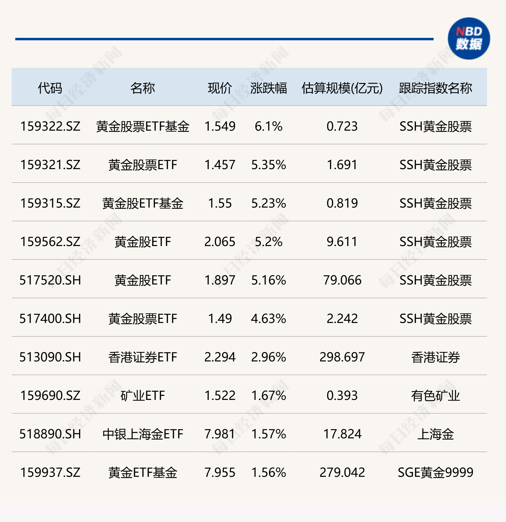 (原标题:ETF今日收评 | 多只黄金股相关ETF涨超5%,半导体相关ETF跌幅居前)