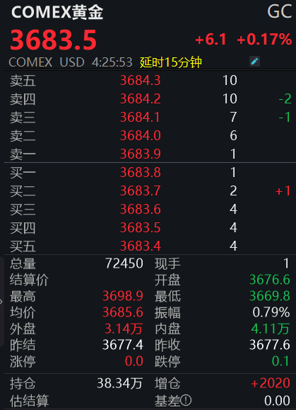 期货市场方面,黄金期货同样表现强劲。截至记者发稿,COMEX黄金期货上涨0.17%,报3683.5美元/盎司,盘中一度最高逼近3700美元/盎司,亦创下新高。Wind数据显示,年内伦敦金现及COMEX黄金期货累计涨幅均已超39%,其中伦敦金现年初至今累计上涨近1000美元/盎司,黄金投资价值凸显。