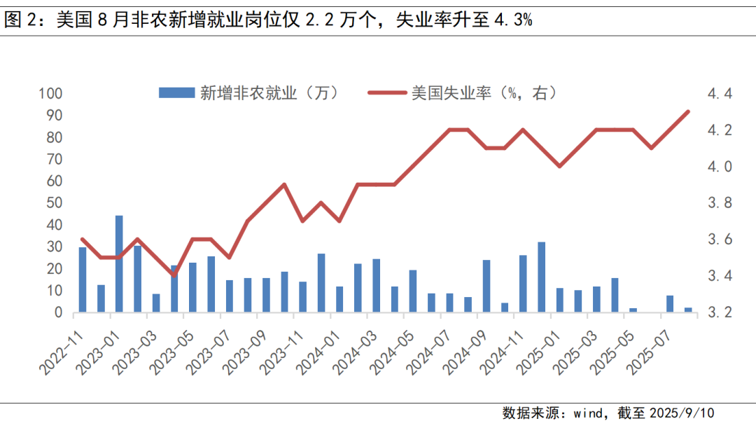 首先,美国宏观经济数据的显著降温是触发金价突破的直接导火索。9月初公布的美国8月非农就业数据显示,新增就业岗位仅2.2万个,远低于市场预期的7.5万个,失业率升至4.3%,创2021年以来新高。这一数据表明美国劳动力市场可能面临“失速”风险,经济放缓压力陡增,几乎为美联储在9月议息会议上重启降息铺平了道路。市场对美联储9月降息25个基点的预期概率升至近100%,甚至开始定价如年内降息三次等更激进的降息情景。降息预期导致美元指数走弱和美债实际收益率下行,显著降低了持有黄金的机会成本,黄金作为避险资产的吸引力进一步凸显。