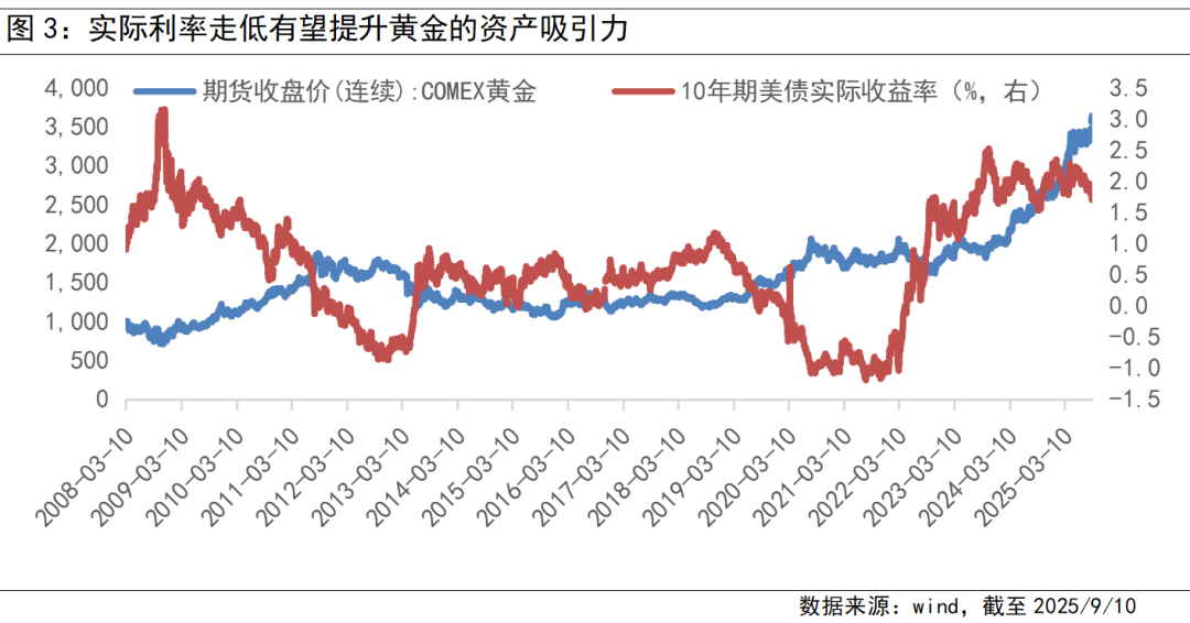 首先,实际利率是持有黄金的关键机会成本指标。当前美国通胀仍具粘性,而市场已普遍预期美联储将在9月降息。一旦降息落地,名义利率的下行速度可能快于通胀预期,导致实际利率走低,从而提升黄金的资产吸引力。此外,降息预期已引导名义利率下行,而持续的贸易摩擦和供应链扰动使美国通胀预期难以快速回落,两者的共同作用使实际利率面临显著下行压力,黄金市场或将迎来新的投资高潮。