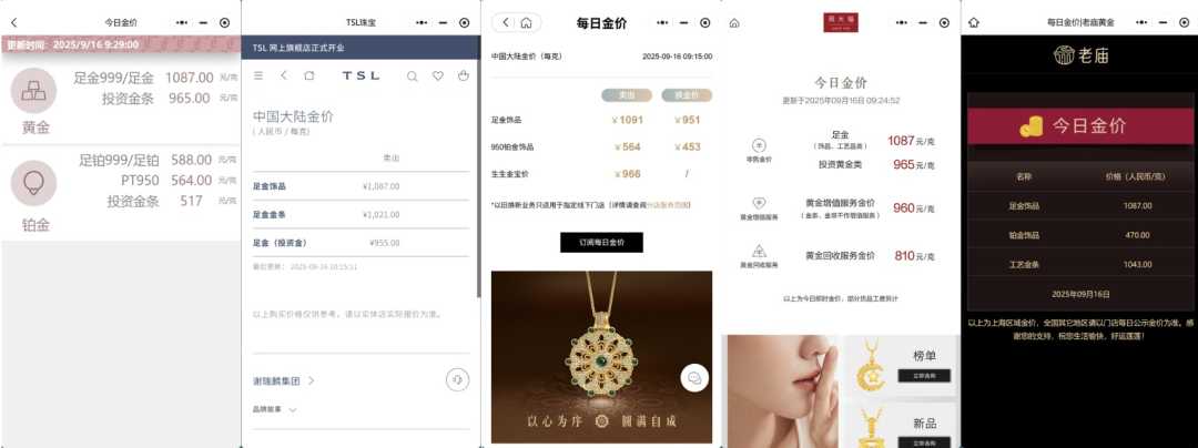 北京时间9月16日,国际金价再创新高,足金饰品价格随之飙升。周生生足金饰品价格达1091元/克,周大福、六福珠宝等品牌价格也升至1087元/克,黄金市场全面上涨。