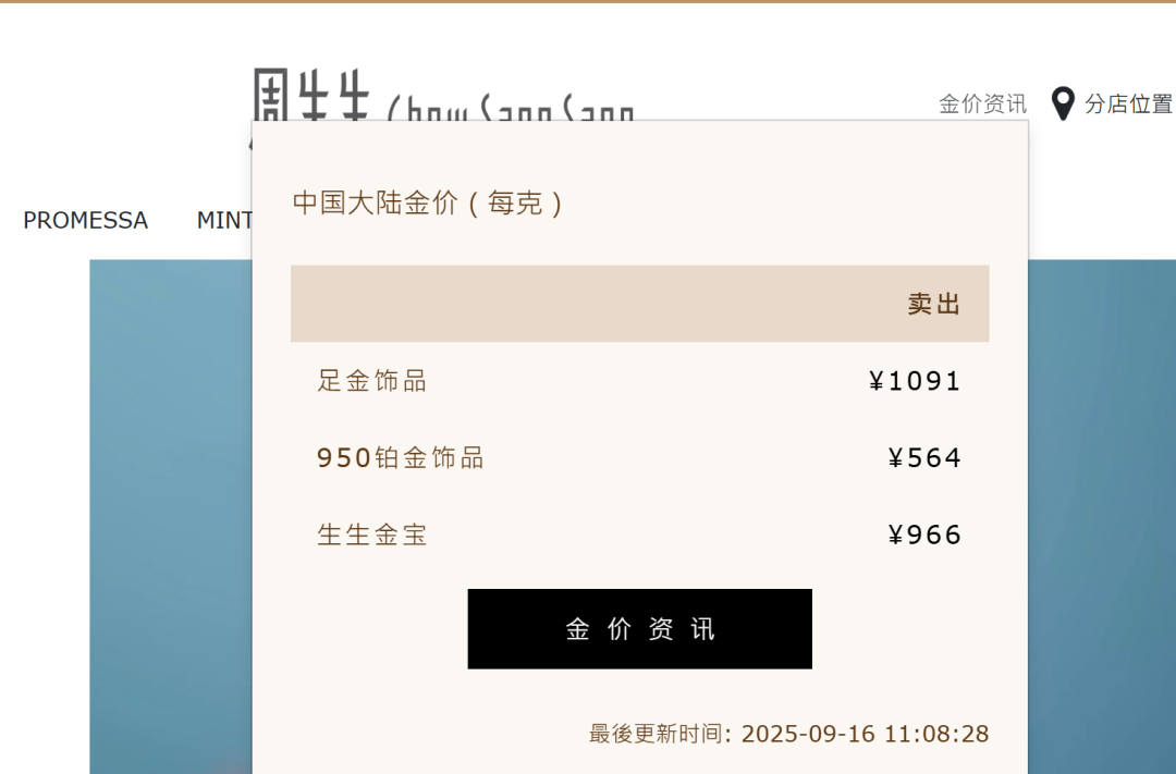 国际金价飙涨下,品牌金饰价格同步攀升。周生生足金饰品价格突破1090元/克,9月16日报1091元/克,较前一日涨17元/克;周大福、六福珠宝、老庙黄金等品牌足金饰品价格亦升至1087元/克。网友直呼:“买不起!”