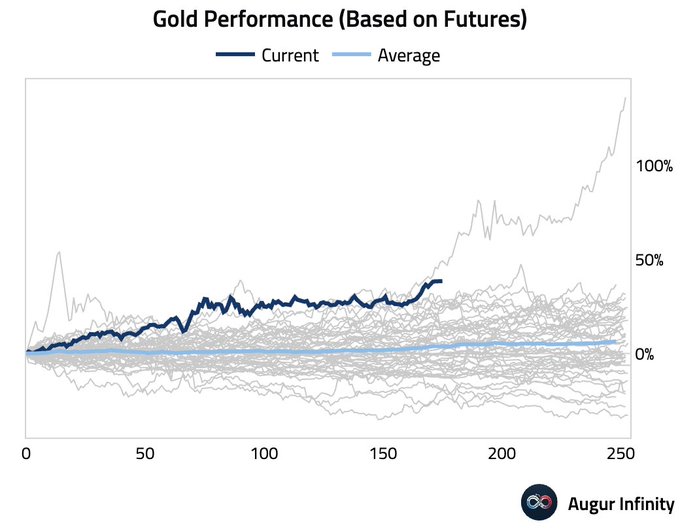 统计显示,上一次金价在某年同期涨幅如此之大,还要追溯到1979年——当时一场全球能源危机引发了通胀冲击,重创了世界经济。在那之后,金价从未在一年同期里出现过如此猛烈的飙升……