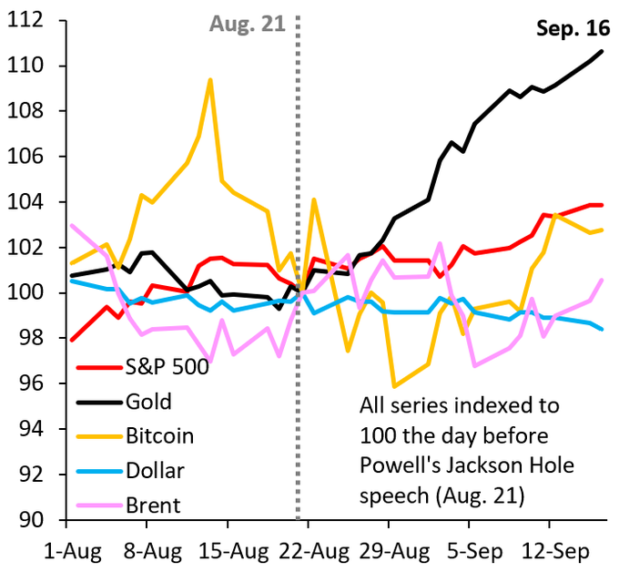 而从近几周的跨资产类别表现看,围绕美联储即将重启降息的宽松预期,显然尤为利好于黄金。如下图所示,自从8月下旬的杰克逊霍尔全球央行年会召开后,金价的涨幅远远跑赢了美股、比特币、美元和原油……