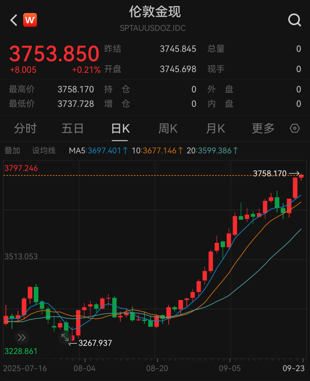 9月23日亚市早盘,现货黄金站上3750美元/盎司关口,最高触及3758.17美元,再创历史新高。截至发稿前,现货黄金稍回落至3753.85美元,涨幅为0.21%,黄金价格波动受市场关注。