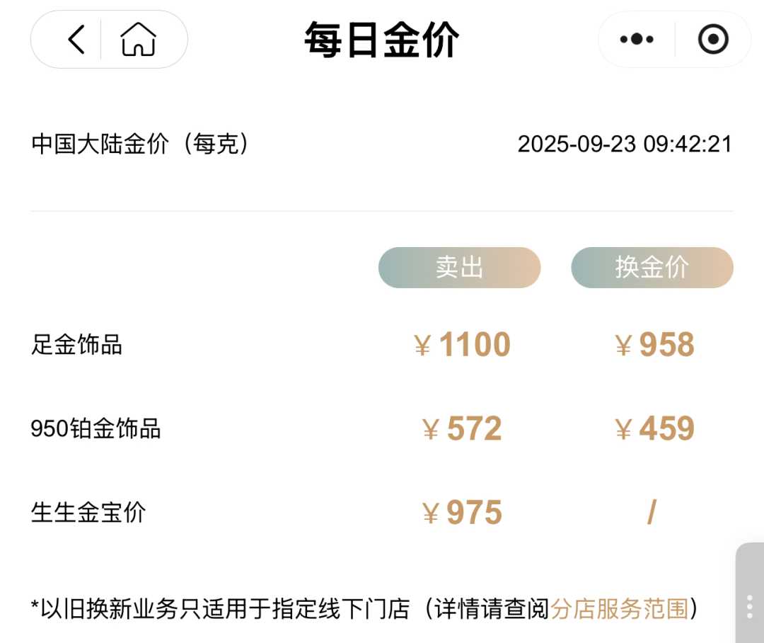 国内黄金饰品方面,数据显示,9月23日,老庙黄金为1097元/克,较前一日的1084元/克大幅上涨;周生生金饰价格为1100元/克,周大福足金首饰报1098元/克,六福珠宝、金至尊为1098元/克,均较前一日有所上涨,黄金饰品价格普涨。