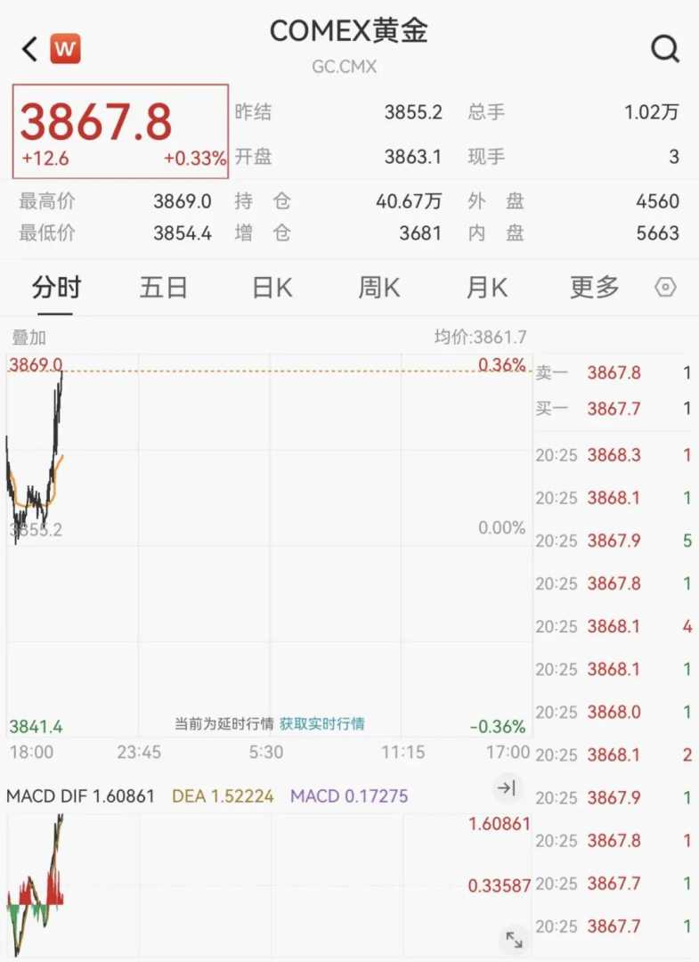 COMEX黄金期货价格同样走高,最高冲至3869美元/盎司,期货市场与现货市场联动,共同推动黄金价格上涨。