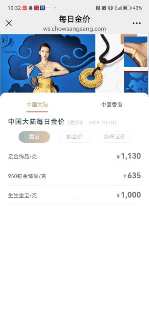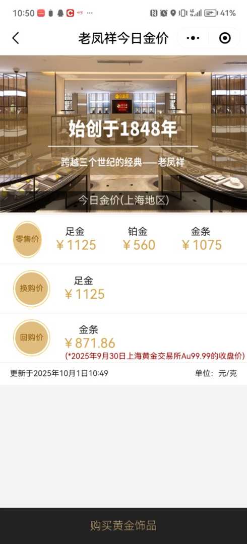 国内金饰价格方面,10月1日,上游新闻记者查询发现,周生生足金饰品标价1130元/克,老凤祥足金饰品标价1125元/克,周大福足金饰品标价1129元/克,各品牌金价均保持高位运行。