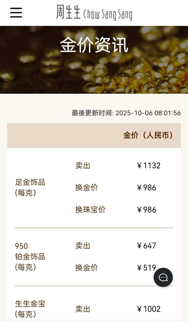 COMEX黄金同步拉升,日内价格一度突破3945美元/盎司;截至发稿,报3934.3美元/盎司,黄金市场表现强劲。金饰价格方面,10月6日,周生生足金饰品标价达到1132元/克,周大福等首饰金报价也在1129元/克上方,黄金消费热度不减。