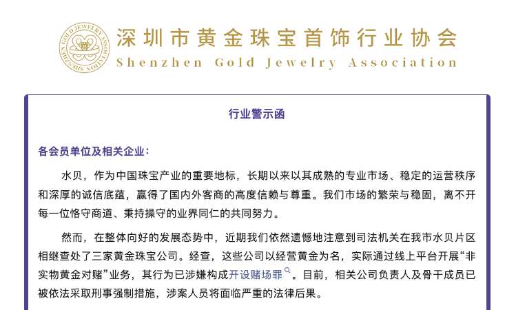 深圳市黄金珠宝首饰行业协会在警示函中提到,被司法机关查处的三家黄金珠宝公司涉嫌构成开设赌场罪。这些案件暴露出,个别企业为牟取非法利益,打着实物黄金交易的幌子,诱导客户进行高杠杆的“买涨买跌”对赌交易,其业务实质已完全脱离黄金珠宝行业的正常经营范围,严重扰乱市场秩序。