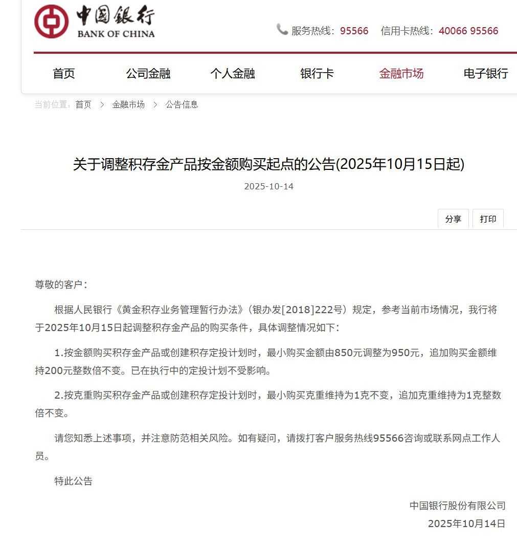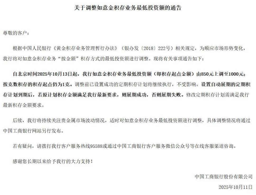此前10月11日,工商银行网站发布通告,为顺应市场形势变化,我行将对如意金积存业务“按金额”积存方式的最低投资额进行调整:自北京时间2025年10月13日起,该行如意金积存业务最低投资额(即积存起点金额)由850元上调至1000元;按克数积存的积存起点仍为1克。