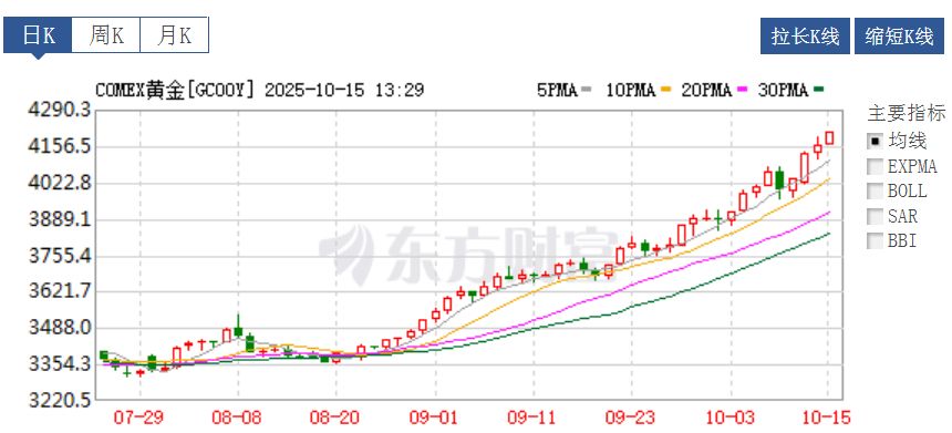 10月15日,国际黄金(黄金)再创历史新高,成为投资市场瞩目的焦点。截至发稿,COMEX黄金突破4200美元/盎司大关,最高触及4210美元/盎司,最大涨幅1.14%;伦敦现货黄金突破4190美元关口,最高触及4193美元/盎司,最高涨幅1.24%。10月以来,国际金价连续突破4000美元、4100美元、4200美元大关,累计涨超300美元,涨幅约8%,投资热潮涌动。