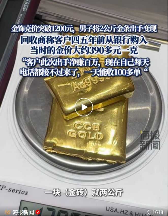 随着黄金价格持续走高,投资和回收市场都迎来热潮。商场再现卖金长龙,顾客要早起拿号排队才能兑。有黄金收兑处工作人员表示,近期来回收的顾客人数比平时多了一半,商场一开门就有人来排队取号,一天可收1000~1500克黄金。今早,“男子变现2公斤金条净赚百万”冲上热搜,让网友直呼太羡慕。