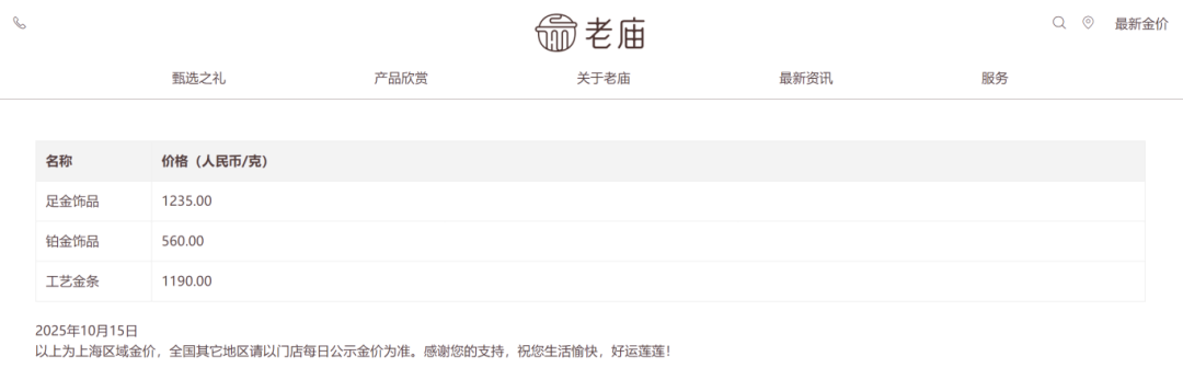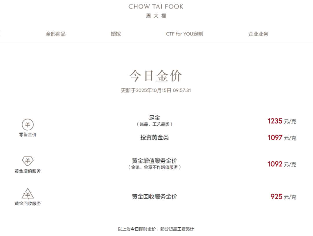 10月15日,国内金饰价格上涨。老庙黄金足金饰品价格为1235元/克,周大福足金(饰品、工艺品类)价格为1235元/克,六福珠宝足金首饰价格为1235元/克,反映了国内黄金市场的繁荣景象。
