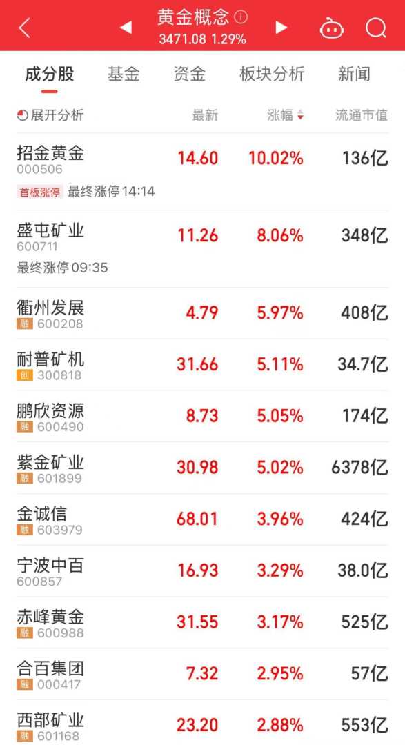 盘面上,10月15日,黄金概念午后探底回升,招金黄金涨停,此前盛屯矿业触及涨停,紫金矿业、鹏欣资源、赤峰黄金、豫光金铅跟涨,显示了黄金板块的强劲走势。