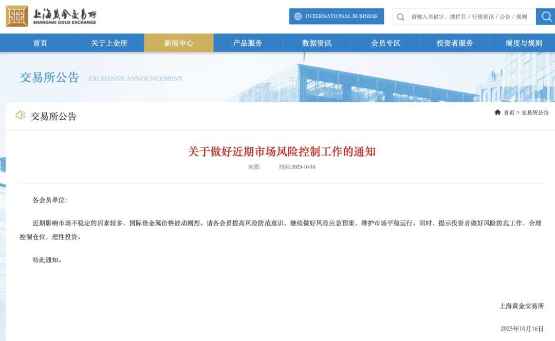 针对近期国际贵金属价格波动剧烈,上海黄金交易所10月16日向各会员单位发布关于做好近期市场风险控制工作的通知,旨在维护市场的稳定运行(风险控制,市场稳定)。