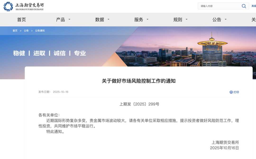 同一天,上期所发布通知,近期国际形势复杂多变,贵金属市场波动较大,请各有关单位采取相应措施,提示投资者做好风险防范工作,理性投资,共同维护市场平稳运行(贵金属市场,理性投资)。