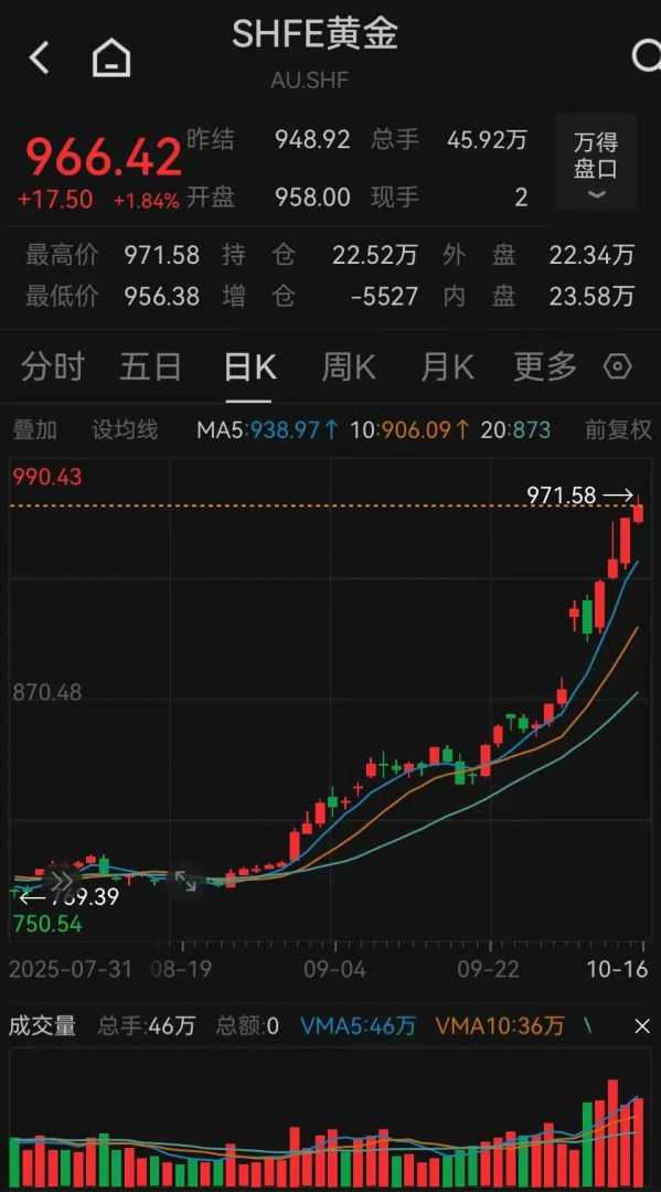 国际价格波动也传导至国内市场。上海期货交易所沪金主力合约16日触及971.58元/克,国庆假期后不断刷新历史新高;沪银主力合约触及12296元/千克,9月以来累计涨幅超过30%;上海黄金交易所黄金T+D、白银T+D年初至今涨幅均在60%左右,国内贵金属市场同样活跃。