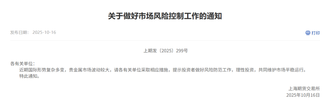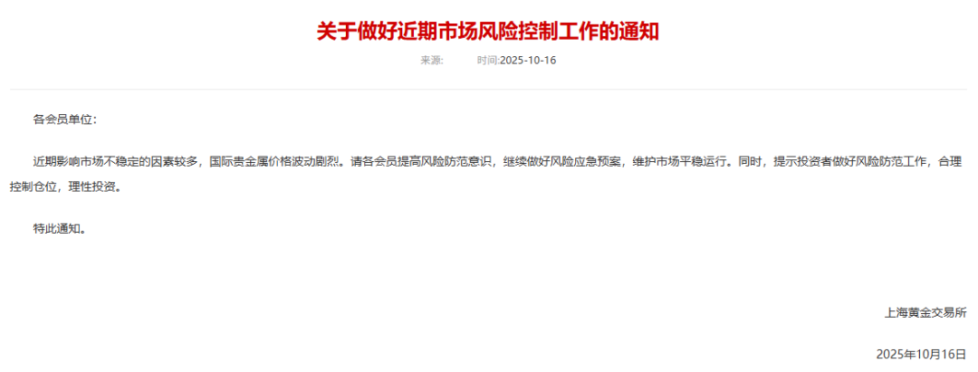 面对短期价格剧烈波动,10月16日,上期所、上金所均发布通知,要求有关单位提示投资者做好风险防范工作。上期所发布通知称:近期国际形势复杂多变,贵金属市场波动较大,请各有关单位采取相应措施,提示投资者做好风险防范工作,理性投资,共同维护市场平稳运行。