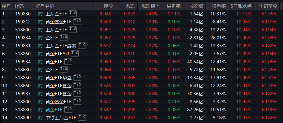 10月17日上午,黄金类ETF依然位居涨幅榜前列,黄金类ETF、上海金ETF等产品年内涨幅已超60%,黄金投资价值凸显。
