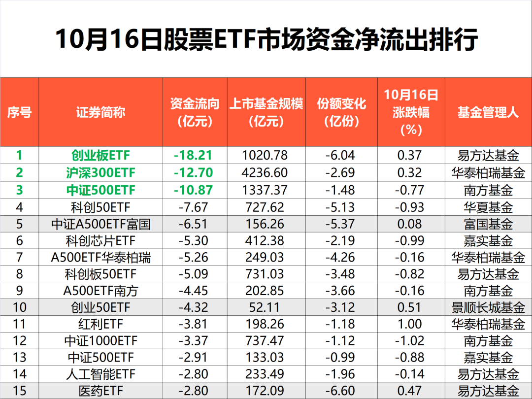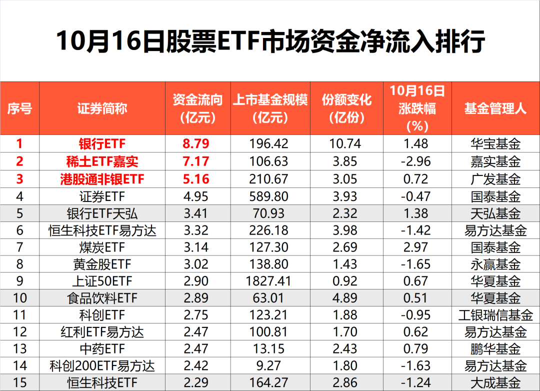 10月16日A股市场风格轮动,资金流向红利板块,黄金赛道近5日吸金超150亿元,SGE黄金9999指数受追捧。股票ETF市场净流出超50亿元,中证A500指数等宽基指数净流出居前。市场震荡下,头部基金公司ETF持续获资金净流入。