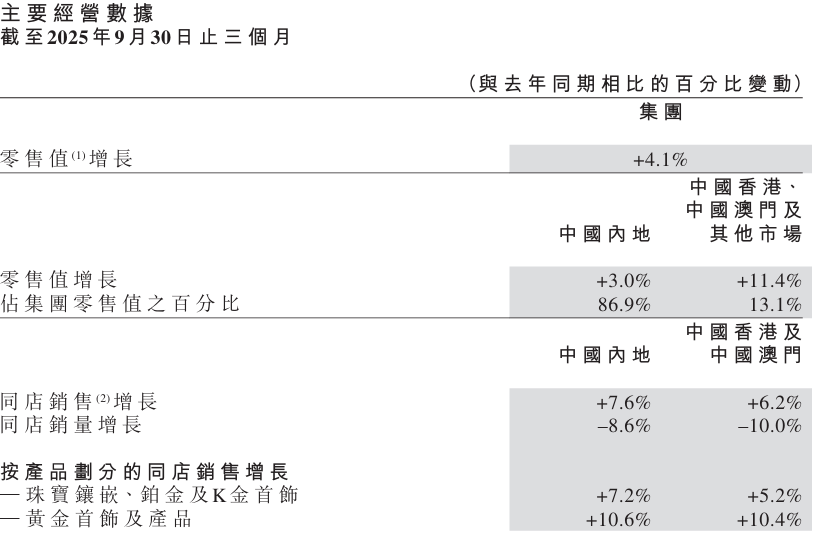 周大福2025Q3经营数据:黄金零售增长4.1%,内地净关店300家
