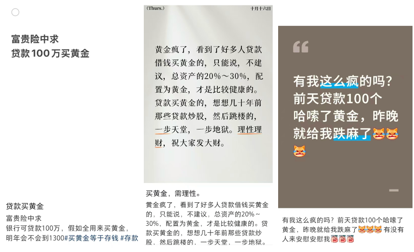 当热度蔓延至社交平台,黄金已经不只是贵金属,而成了大众语境中的热点符号。“高位站岗怎么办?”“贷款买黄金还能解套吗?”“这波是像今年422那样回调,还是新一轮起点?”——由于17日黄金从高点回调,财联社记者在小红书等平台上搜寻“黄金”相关内容,以上帖子频频可见。