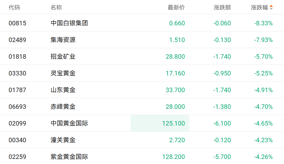 截至发稿,中国白银集团(00815.HK)跌8.33%、招金矿业(01818.HK)跌5.70%、灵宝黄金(03330.HK)跌5.25%、山东黄金(01787.HK)跌4.91%。