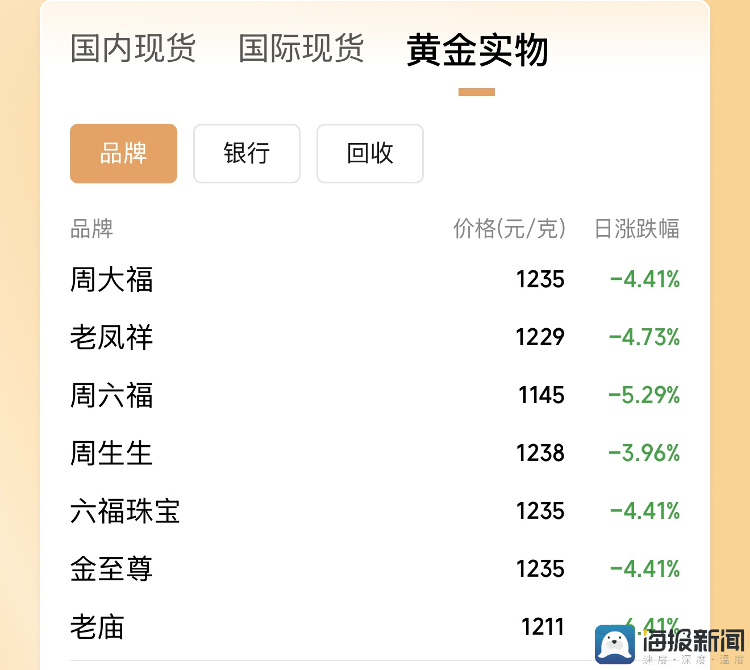 国际黄金市场大跳水,国内金饰品牌集体下调金价