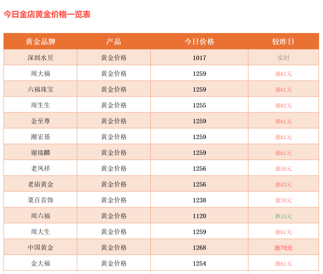 其中,周大福等每克涨61元,单日涨幅达5.09%;老庙黄金、周生生等单日涨幅超过5.2%;中国黄金涨幅最大,上调78元/克,单日涨幅达6.2%。