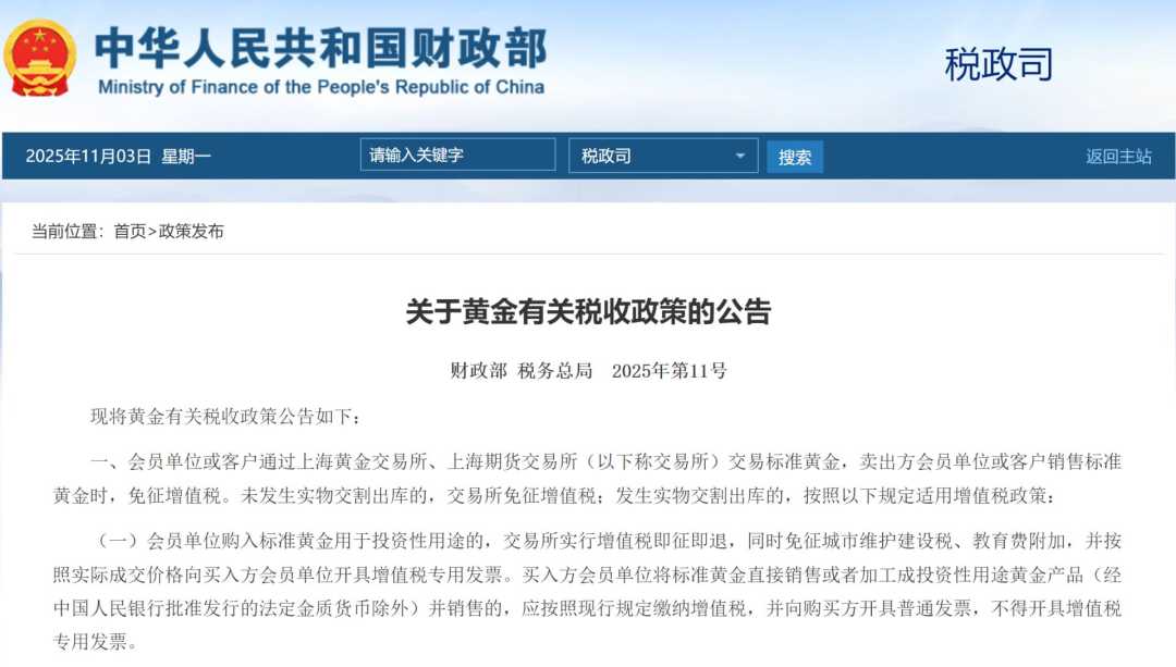 此外,兴业银行也发布《关于暂缓积存金兑换(提取)实物金业务的对客提示》,根据2025年11月1日《财政部、国家税务总局发布关于黄金有关税收政策的公告》,为有效保障投资者权益,优化实物金供给与配送,该行从2025年11月3日开始暂缓受理积存金兑换(提取)实物金、添利金条产品购买及兑换(提取)实物金申请。