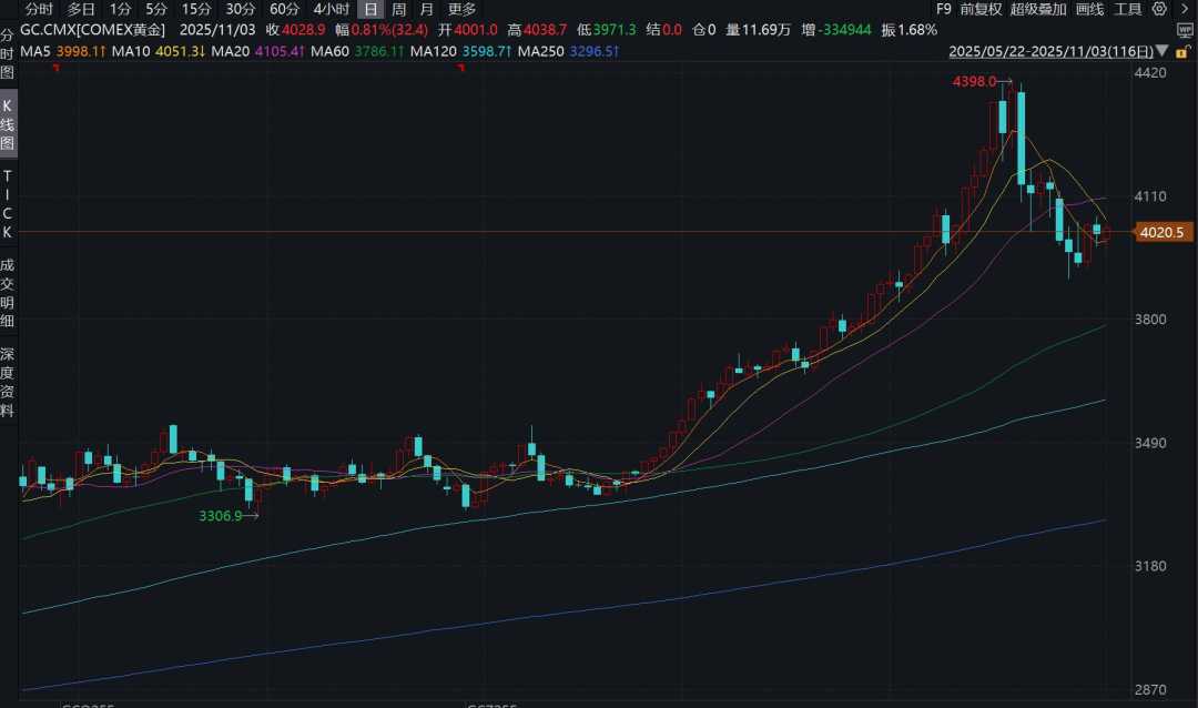 11月3日黄金饰品售价突然上涨,水贝黄金整体加价约7%,品牌金店价格也涨约60元。当日黄金零售端售价涨约60元/克,消费者买卖实物黄金饰品价差增大。同时,国际金价近期显著回调,受多头获利了结和避险情绪降温影响,但金价长期上行核心因素未变,回调空间料将有限。