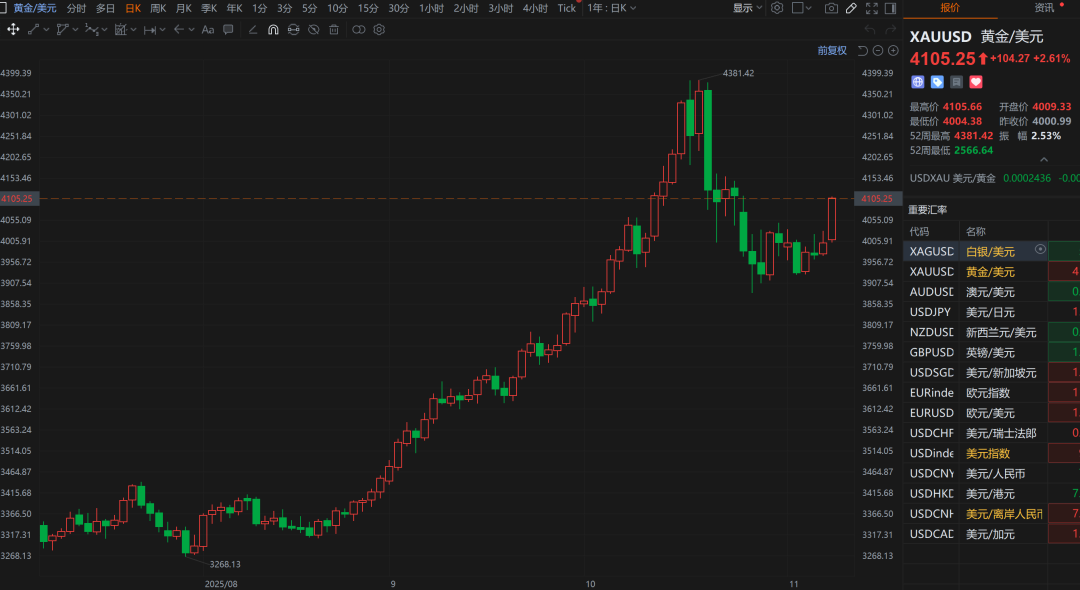 昨日,现货黄金价格持续走高,美股盘前向上突破4100美元/盎司,为10月27日以来首次,日内涨超2.6%。纽约期金价格同样突破4100美元/盎司,涨2.32%。现货白银价格涨逾3.6%,纽约期银价格大涨4%。黄金市场近期表现强劲,成为投资者关注的焦点。