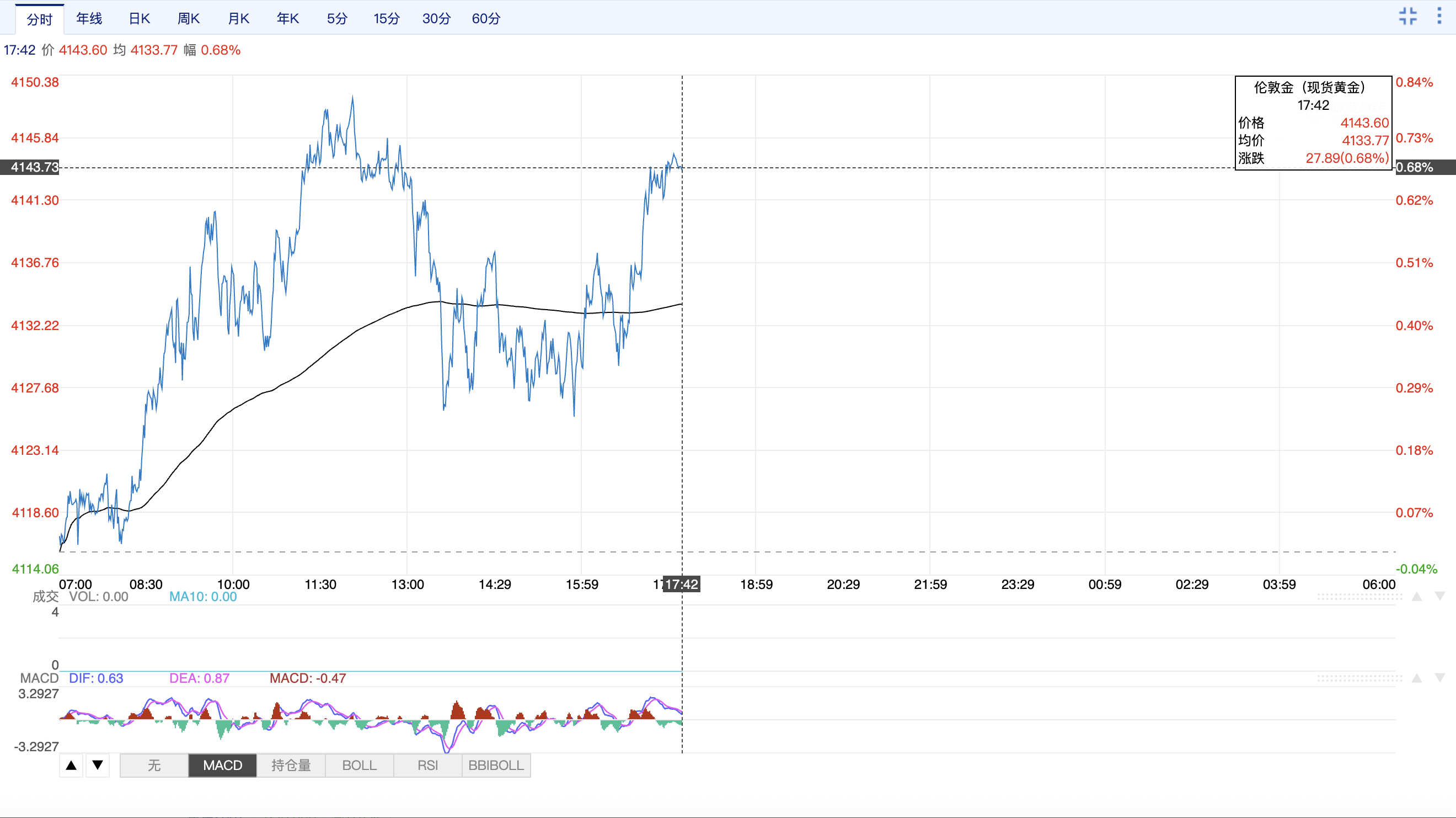 “越等越难下手”的情况会在黄金交易领域上演吗?近期黄金市场波动引发关注,投资者对黄金投资时机把握愈发谨慎。11月11日,国际金价大涨,日内开盘价为4116.20美元/盎司,盘中冲高至4148.91美元/盎司,随后回落,11日17:30时的价格在4143美元/盎司,较昨日4115美元/盎司的收盘价,涨幅约为28美元/盎司。10月下旬的国际金价走势以下跌为主,在11月连涨几日后,11日17:30时的报价较10月20日现货黄金价格4381.29美元/盎司的高位仍有明显回落。
