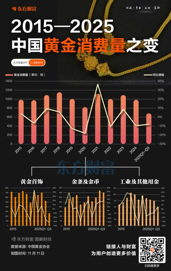 11月10日,中国黄金协会发布的数据显示,2025年前三季度,我国黄金消费量682.73吨,同比下降7.95%。其中,下降最多的是消费黄金首饰,前三季度同比下降32.50%。但不同品类表现分化显著。同期,金条、金币、工业及其他用金都出现不同程度的增长,尤其是金条及金币同比增长24.55%,黄金投资需求旺盛。