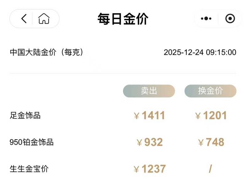 国内黄金饰品价格今日上调