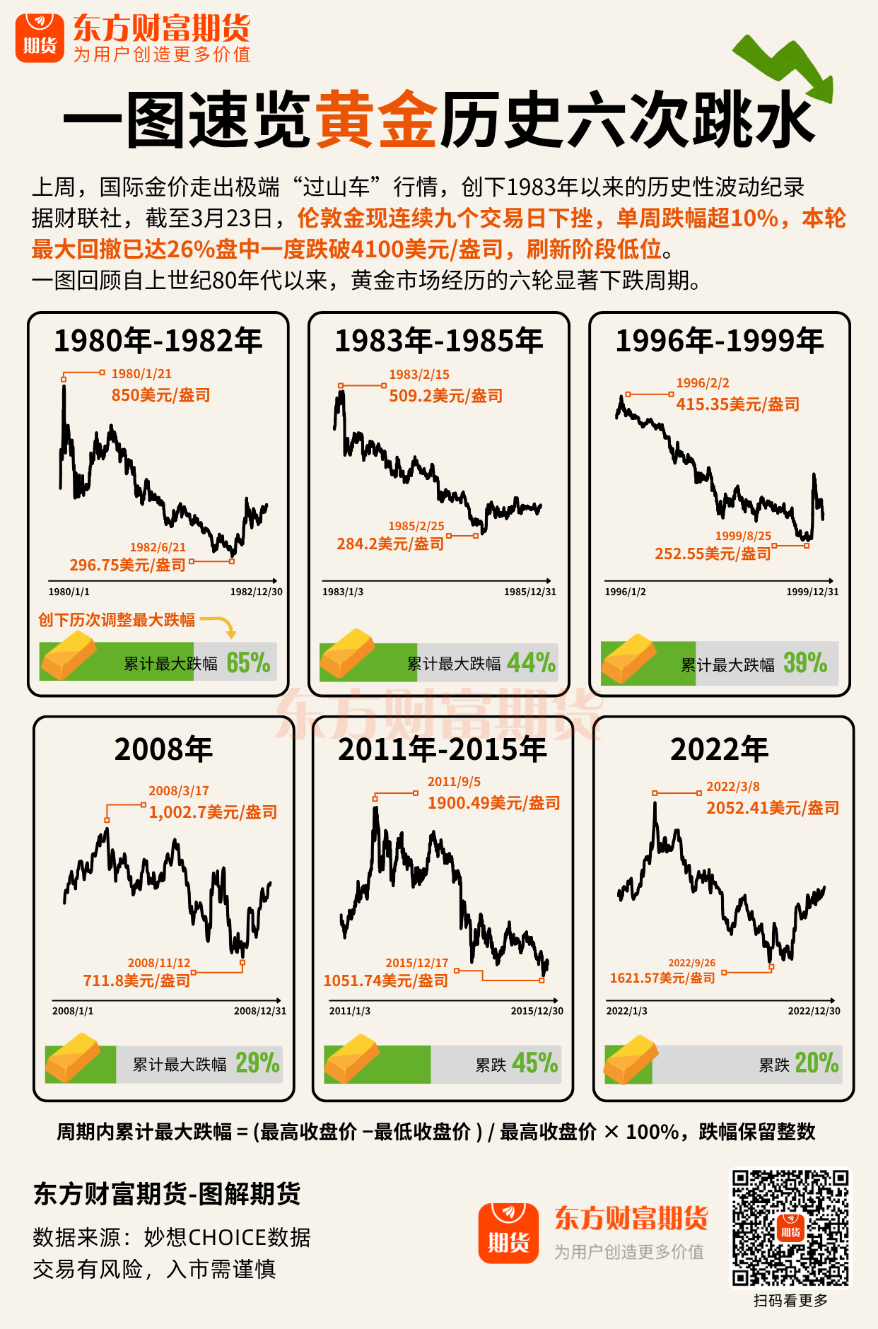 一图回顾自上世纪80年代以来,黄金市场经历的六轮显著下跌周期。