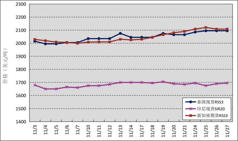 国外主产区:11月,泰国RSS3平均价格2048美元/吨,环比上涨6美元/吨,最高价2095美元/吨,最低价1995美元/吨;印尼SIR20平均价格1683美元/吨,环比下跌9美元/吨,最高价1705美元/吨,最低价1650美元/吨;新加坡RSS3期货主力合约月均结算价格2047美元/吨,环比上涨26美元/吨,最高价2120美元/吨,最低价1999美元/吨。