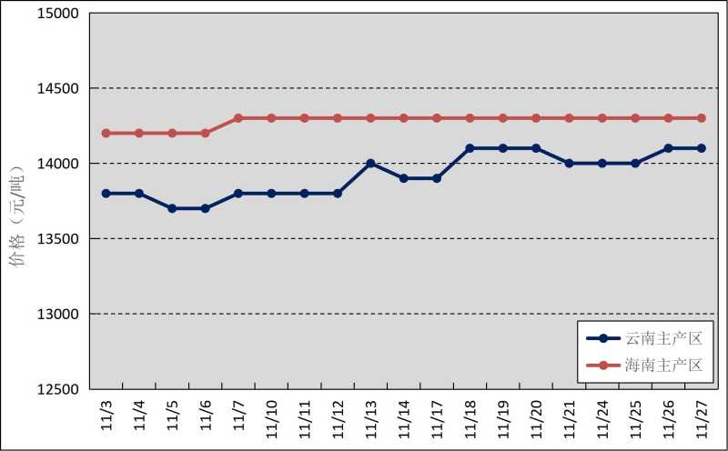 国内主产区:11月,云南产区生产较为稳定,原料正常释放,海南产区天气状况改善,原料价格波动不大。云南、海南鲜胶乳(折干胶)月均价格分别为13921元/吨、14279元/吨,环比分别上涨98元/吨、526元/吨。