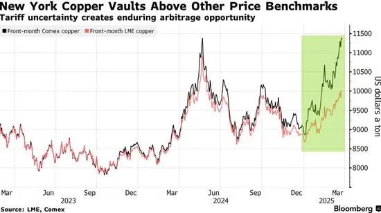 今年以来,铜近月合约已飙升29%,导致美国价格与全球基准价格之间出现前所未有的脱节。对冲基金Quantix Commodities的投资者解决方案主管Matt Schwab表示,关税的不确定性,尤其是关税何时实施,将使价差保持在较高水平。