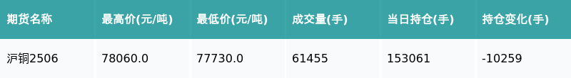 南财智讯5月22日电,南财金融终端盘后期货数据显示,上海期货交易所的沪铜主力合约收跌0.22%,收盘报77920.0元/吨,日内资金流出高达8.29亿元,市场交投氛围谨慎。铜作为重要的工业原材料,其价格波动对下游制造业具有重要影响。以下是详细的期货数据及相关指标表格: