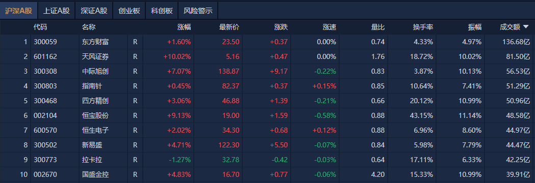 沪深两市半日成交额9913亿元,较上个交易日放量138亿,市场活跃度提升。个股方面,东方财富成交额超136亿元居首,天风证券、中际旭创、指南针成交额靠前。