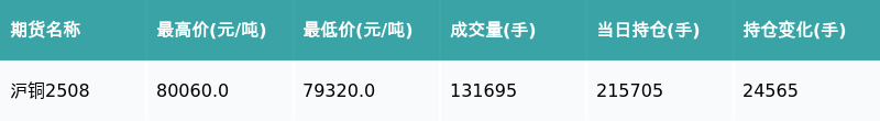 6月27日南财金融终端盘后期货数据显示,沪铜主力合约收涨1.5%,收盘报79920.0元/吨,日内资金流入19.44亿元,市场看好铜市前景。