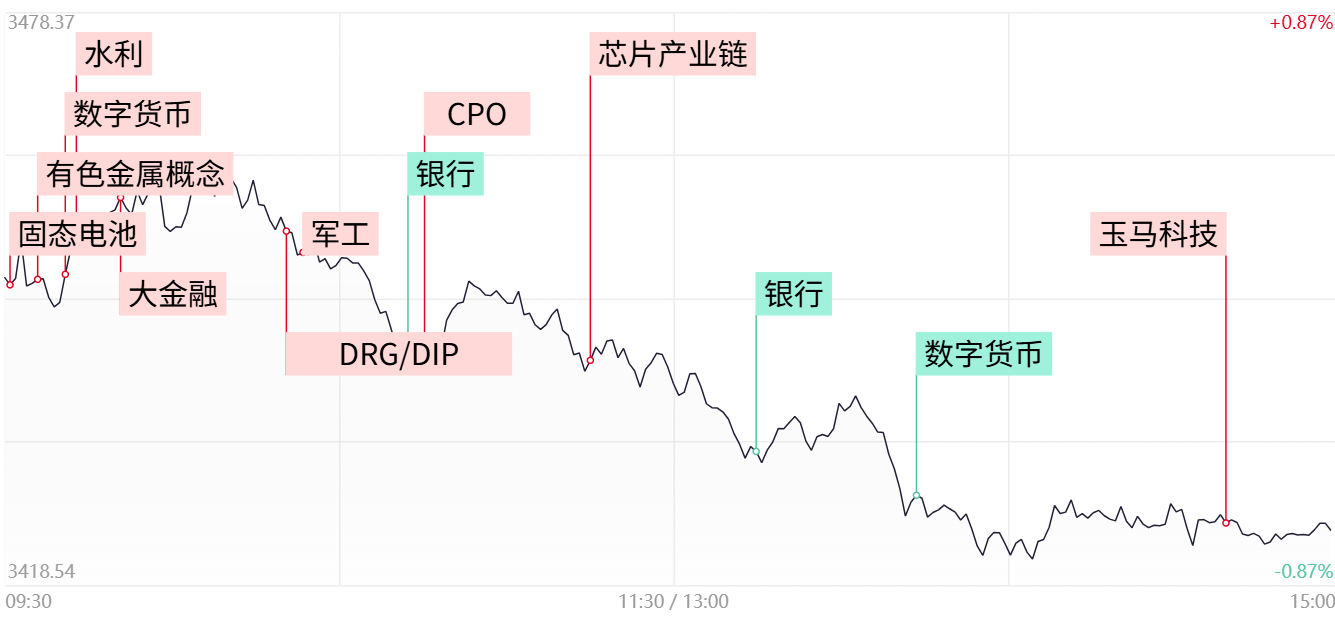 今日市场震荡分化,三大指数涨跌不一,其中沪指受到了银行股下跌的拖累再度回调至5日线附近。截至目前市场整体的亏钱效应尚可,今日跌超9%的个股数量不足10家,而两市成交额依旧维持于1.5万亿之上。故虽然指数连续两日调整,但仍处于涨多修正的范畴之中,后续可重点留意本周三所留下的大量低点3417,只要不将其有效跌破的话,沪指便仍有望维持偏强上涨结构。另外从盘面角度来看,目前市场风格以轮动为主,大金融、数字货币、固态电池等近期热点题材相继分化整理,而算力硬件、消费电子,半导体等科技板块纷纷走强,本质上还是由于缺乏足够的增量资金,导致市场热点进行高低切。应对上把握节奏仍是关键,在不出现破坏性下跌的背景下,留意热门板块回调整理过程中的低吸机会。